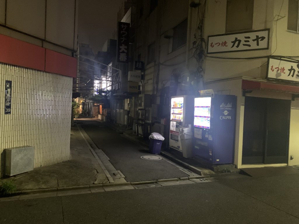 1階の休憩スペースには、自動販売機が設置されており、カップラーメンやアルコール類も購入できるようになっていました。
